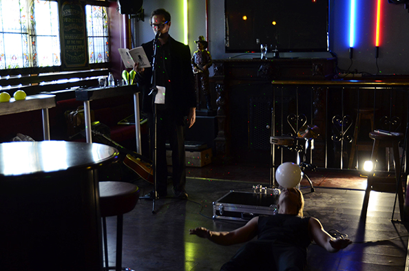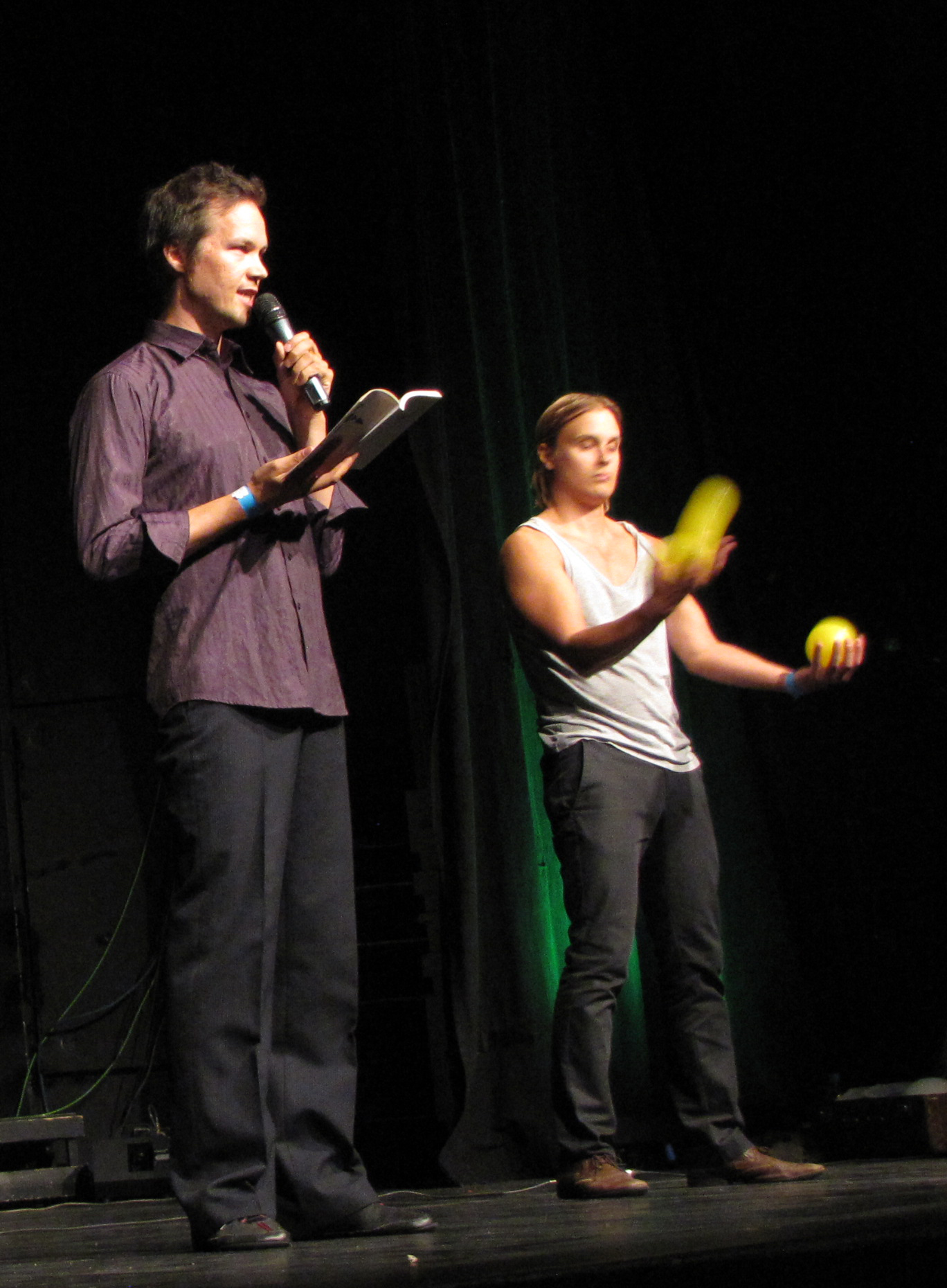 Juha Rautio (lausunta ja musiikki) ja Miika Nuutinen (lausunta ja jongleeraus)