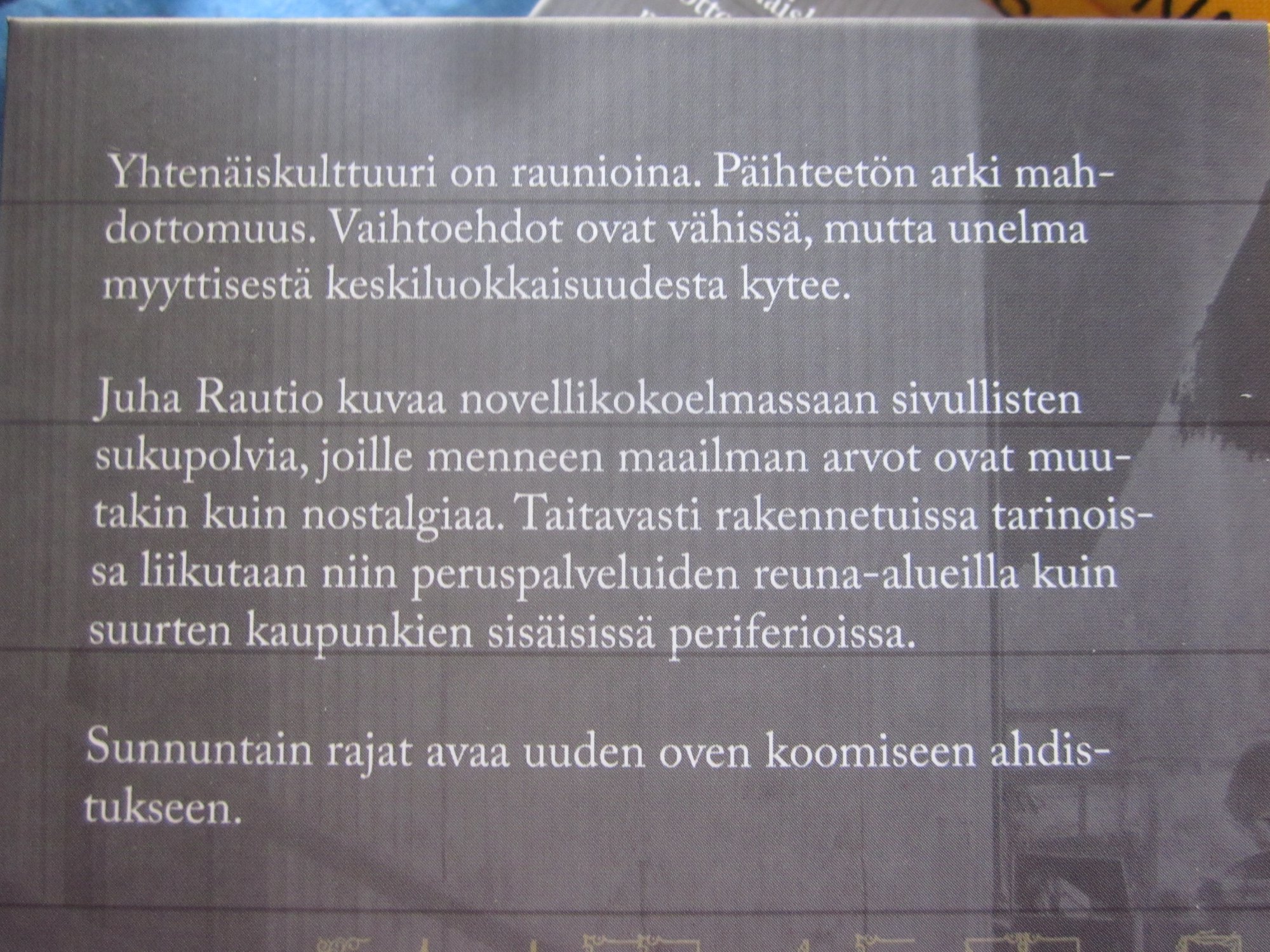 Kuultuaan uutisen sanoi runoilijakollegani: ”Et ole ensimmäinen runoilija, joka on siirtynyt proosaan.” Kuten hänellekin totesin, ollos huoleton, en ole siirtymässä mihinkään. Runokokoelma on tulossa taas ensi vuonna, mutta tämä käsissäni oleva kirja on tosiaan novelleja. En siis ole kiitämässä marginaaleista spottivaloihin, mutta nyt myös runousrajoittuneet voivat nauttia rautionsa kansien välistä. Sunnuntain rajat kuvaa 2000-luvun ensimmäistä vuosikymmentä ja elämänpiiriä, jonka opin tuona aikana tuntemaan. Koomista ahdistusta ja sivullisten ponnistelua niin syrjäseuduilla kuin suurten kaupunkien sisäisissä periferioissa. Eräs lukija kuvasi novelleja: ”Näissä on sellaista vanhan ajan kirjallisuuden tuntua, josta nautin kovasti.” Vanhaa aikaa siis ennen älypuhelimia eikä internetkään ole koko ajan päällä. Kirjatilaukset ensisijaisesti Enostonen verkkokaupasta https://enostone.fi/tuote/rautio-juha-sunnuntain-rajat/ Sivuilta löytyy myös pieni pdf-muotoinen näyte. Julkkareista tietoa myöhemmin.