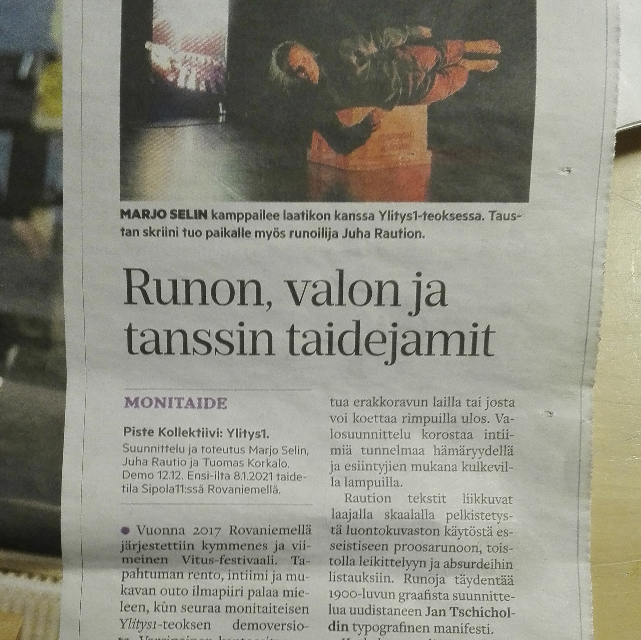 Teimme viime viikonloppuna demoesityksen monitaiteisesta Ylitys 1:stä. Koronaepidemian vuoksi esiinnyin kotoani käsin, muu työryhmä oli paikan päällä Rovaniemellä. Kriitikko Tenka Issakainen kirjoitti teoksestamme Lapin Kansassa: ”Kaikkiaan Ylitys 1:n kepeydessä on jotain hyvällä tavalla retroa: kaikuja underground-happeningeista ja dadaistien esityksistä. Samalla teoksesta paistavat leikin ilo ja esiintyjien luottamus toisiinsa.”