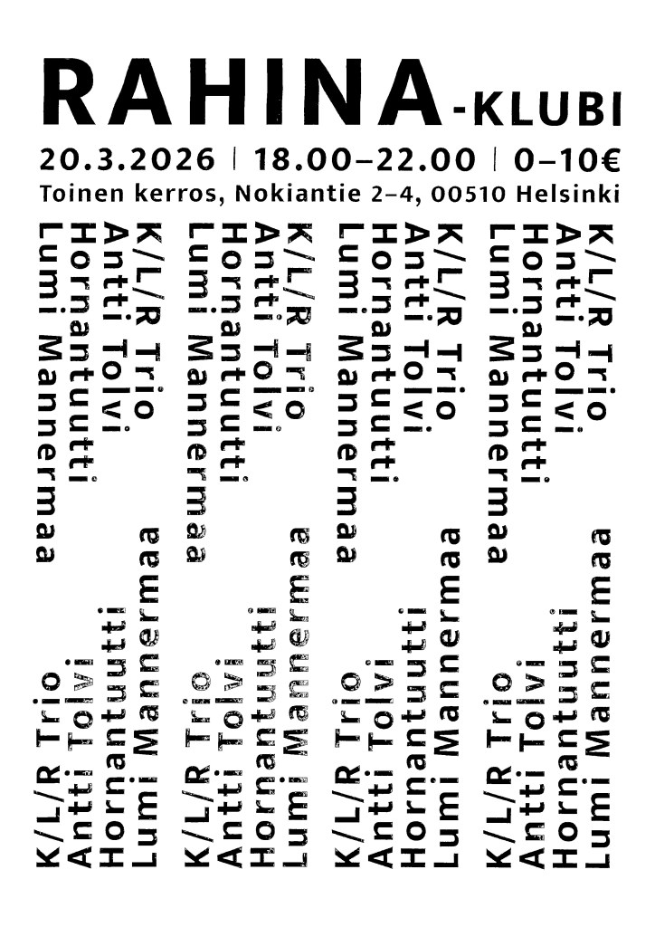 HIO’s March concert will be held in Merihaka residents’ association’s kylätupa on 27.3. The program will include free and conducted improvisation. The concerts in kylätupa will be part of Club Rahina’s program. Kylätupa is located on the deck level, opposite to the restaurant Sir Oliver, at Haapaniemenkatu 14. The concert starts at 7pm and entrance is free of charge.