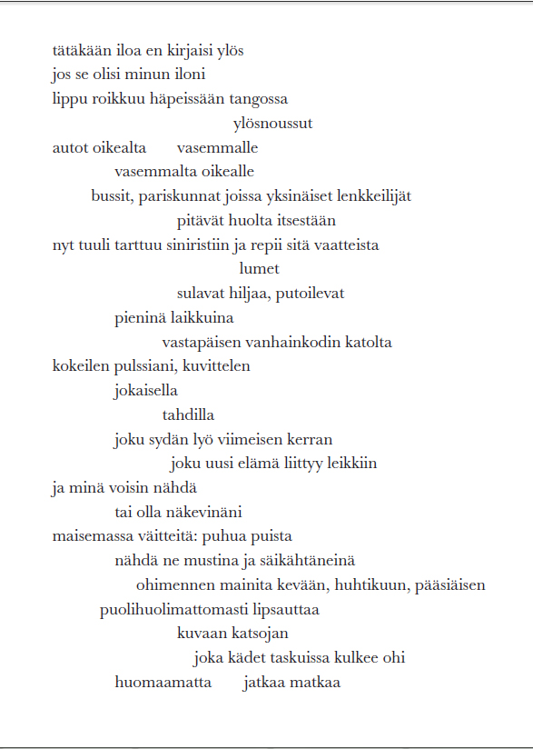 Kirjoitan sinulle kaukaisesta maasta, minulla ei ole mitään asiaa, minua väsyttää mutta uni ei tule, haluaisin että joku jakaisi päiväni kanssani, en tarvitse tätä kaikkea tilaa, kaikki kiertää kehää, tällaisia minä mietin, en muista sinusta mitään, olitko joskus osa elämääni? minun elämässäni ei nykyään tapahdu mitään, tapahtuuko sinun? minun selkääni särkee ja vatsani kasvaa, mutta minä en synnytä mitään, usein minä ajattelen sinua, ketä minä ajattelen? anteeksi että en ole kirjoittanut, minun on kyllä ollut tarkoitus, mutta jotenkin minusta tuntuu kuin päiväni olisivat lakanneet kuulumasta kenellekään, kuuletko sinä? olenko minä sairastunut vai onko minä sairaus, kysyinkö minä tätä jo? en tiedä enää mitään, joko sinä olet hankkiutunut lapsistamme eroon, mitkä nimet me niille annoimmekaan? äh, olen pahoillani, mihin minä jäin, mihin sinä jäit, jäimmekö me vai jätettiinkö meidät? miksei kukaan vastaa? sinä olet ihmiskunta, tiedätkö mitä et tee? minä, sinä, kerran me puhuimme samoista asioista, samoilla sanoilla, meillä oli nauhoitetut vuorosanat. Olimme näkevinämme horisontin märkivissä haavoissa auringonlaskun